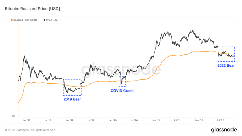 Ďalšia vzácna udalosť sa vyskytla v jednom z najstarších ukazovateľov BTC – realizovanej cene. Realizovaná cena je realizovaná trhová kapitalizácia vydelená počtom BTC v obehu. Inými slovami, realizovaná cena sa dá opísať aj ako cenová základňa bitcoinu. Keď trhová cena klesne pod realizovanú cenu, nastávajú podmienky dna. Cena BTC bola počas histórie BTC pod úrovňou realizovanej ceny len niekoľkokrát, pričom naposledy sa tak stalo počas "COVID pádu", ku ktorému došlo v marci 2020. Vzhľadom na akumuláciu, ku ktorej dochádza v kohortách dlhodobých držiteľov, je zrejmé, že mnohí sa domnievajú, že ide o historický nákupný signál.