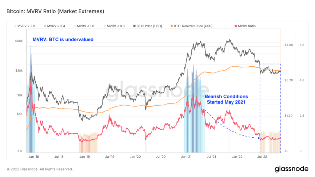 Pomer MVRV predstavuje trhovú kapitalizáciu bitcoinu vydelenú jeho realizovanou kapitalizáciou (MVRV = Market Cap / Realized Cap) a je užitočný na meranie vrcholov a dna trhu BTC. Realizovaná kapitalizácia je alternatívou k trhovej kapitalizácii na hodnotenie siete BTC. Trhová kapitalizácia sa vypočíta vynásobením všetkých mincí v obehu poslednou uzatváracou cenou, zatiaľ čo realizovaná kapitalizácia sa vypočíta súčtom hodnoty všetkých mincí pri ich poslednom pohybe v reťazci. Tak sa investorom poskytuje cenová základňa bitcoinu v reťazci. Keď MVRV klesne pod hodnotu 1,0, s bitcoinom sa obchoduje pod jeho "férovou hodnotou", čo signalizuje medvedie podmienky na trhu a všeobecný nedostatok dopytu. Hodnoty MVRV pod 0,8 v minulosti pomerne spoľahlivo označovali dná cyklov – pričom naposledy sa vyskytli v hĺbke medvedieho trhu v rokoch 2018 až 2019. Od polovice júna sa cena bitcoinu posúvala pod svoju realizovanú cenu a stabilne sa pohybovala okolo úrovne 20 000 dolárov. Relatívne nižšie ceny možno považovať za potenciálne atraktívnu akvizičnú cenu pre nových investorov alebo pre skúsených hodlerov na doplnenie ich pozícií.