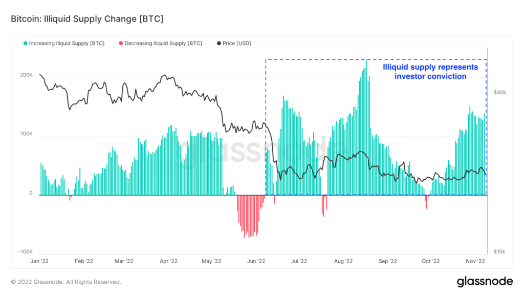 Uvedený graf potvrdzuje predpoklad, že nelikvidná ponuka BTC sa celý rok neustále zvyšuje. Napriek odlevom, ku ktorým došlo v júni 2022, je čistá akumulácia medzi investormi stále pozitívna a viac bitcoinov sa ukladá do "cold storage". To znamená, že aj odlev z búrz do vlastnej úschovy prevyšuje počet investorov, ktorí posielajú mince na burzy na odkúpenie. Za posledný mesiac bol viditeľný nárast mincí, ktoré sa stali nelikvidnejšími, keďže investori sa presúvajú k nákupu lacnejších BTC. Súčasný medvedí trh bol pre projekty súvisiace s kryptomenami a altcoinmi náročný, pričom mnohé z nich zažívajú prepad o viac ako 90 percent. Počas minulých medvedích trhov investori čoraz častejšie presúvali svoje držby späť do bitcoinu a stablecoinov, aby prežili trh, kým nepríde ďalšia býčia rely.