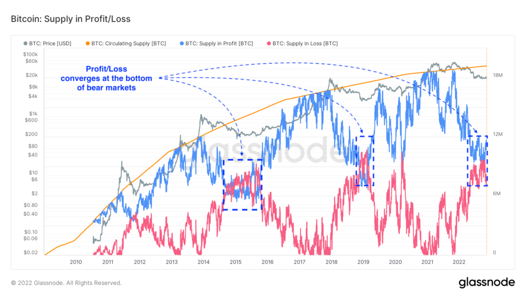 Pri kúpe alebo predaji bitcoinu sa jeho nadobúdacia cena zaznamená do UTXO transakcie (Neutratený výstup transakcie) a uloží sa do blockchainu bitcoinu. Uvedený graf znázorňuje objem ponuky BTC v zisku (modrá) a strate (červená) v porovnaní s ponukou bitcoinov v obehu (žltá čiara). Vzťah medzi mincami držanými v zisku a strate je nepriamo úmerný, keďže každý token musí byť v jednej alebo druhej kategórii. Oblasti ponuky sa menia podľa toho, ako sa mení spotová cena BTC a pohybuje sa nad alebo pod hodnotami UTXO. Veľké zmeny v zisku a strate spojené s relatívne malými pohybmi ceny naznačujú veľký počet mincí pohybujúcich sa v tejto cenovej oblasti. K tomu zvyčajne dochádza po dlhých obdobiach konsolidácie, keď značný počet BTC mení majiteľov. Minulé medvedie trhy sa podobajú súčasnému trhu, keď sa PnL pohybovali bližšie k sebe a konvergovali okolo dna minulých cyklov. Tieto obdobia môžu trvať mesiace, ale nakoniec sa zlomia, keď sa trh obráti a začne sa nová býčia rely.