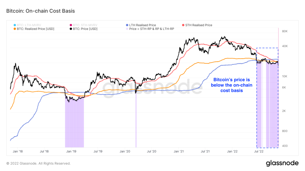 Keď sa trh s bitcoinmi vyvíja okolo určitej nálady, kľúčové ukazovatele výkonnosti (KPI), ako sú MVRV, realizovaná cena a indikátor SOPR, môžu o stave trhu vypovedať to isté. Tento jav sa nazýva konvergencia a nastáva vtedy, keď metriky založené na rôznych súboroch údajov dospejú k rovnakému záveru o nálade na trhu. Jeden z najstarších ukazovateľov na reťazci bitcoinu, realizovaná cena, je opäť nad spotovou cenou BTC. K tomu dochádza len v hĺbke medvedích trhov, keď sa priemerná cenová základňa na reťazci dostane do straty. Na grafe vyššie je znázornená realizovaná cena (oranžová čiara) spolu s realizovanou cenou krátkodobých a dlhodobých držiteľov (STH a LTH) (červená a modrá čiara) spolu s binárnym indikátorom (fialové tieňovanie), ktorý ukazuje, kedy je spotová cena BTC pod všetkými tromi. Súčasné trhové podmienky vykazujú silnú konvergenciu s uvedenými tromi ukazovateľmi a sú v súlade s ostatnými ukazovateľmi, ktoré v tejto správe indikujú dno. Na súčasnom trhu panuje značné presvedčenie dlhodobých držiteľov. Ale ak sa cena BTC bude naďalej oslabovať, šance na kapituláciu LTH sa zvýšia.