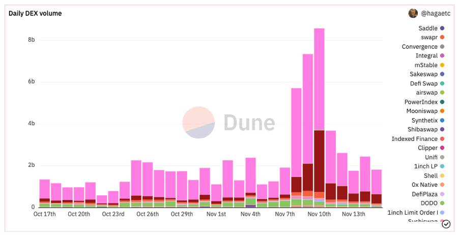 4. Význam DeFi: Počas mnohých tohtoročných rozvratov trhu, od Celsius, BlockFi, Three Arrows Capital až po FTX a Alameda, fungovali protokoly DeFi presne tak, ako mali. DeFi predstavuje jedinečnú príležitosť na transakcie bez toho, aby ste museli dôverovať akýmkoľvek centralizovaným subjektom, ktoré sú neprehľadné a zavádzajú ťažko kvantifikovateľné riziko protistrany. Namiesto toho DeFi funguje na verejných blockchainoch, kde je možné transparentne vidieť stav protokolu, obchodovať a navzájom si požičiavať bez potreby dôvery. Po páde FTX sa objemy obchodovania na decentralizovaných burzách nakrátko prudko zvýšili.