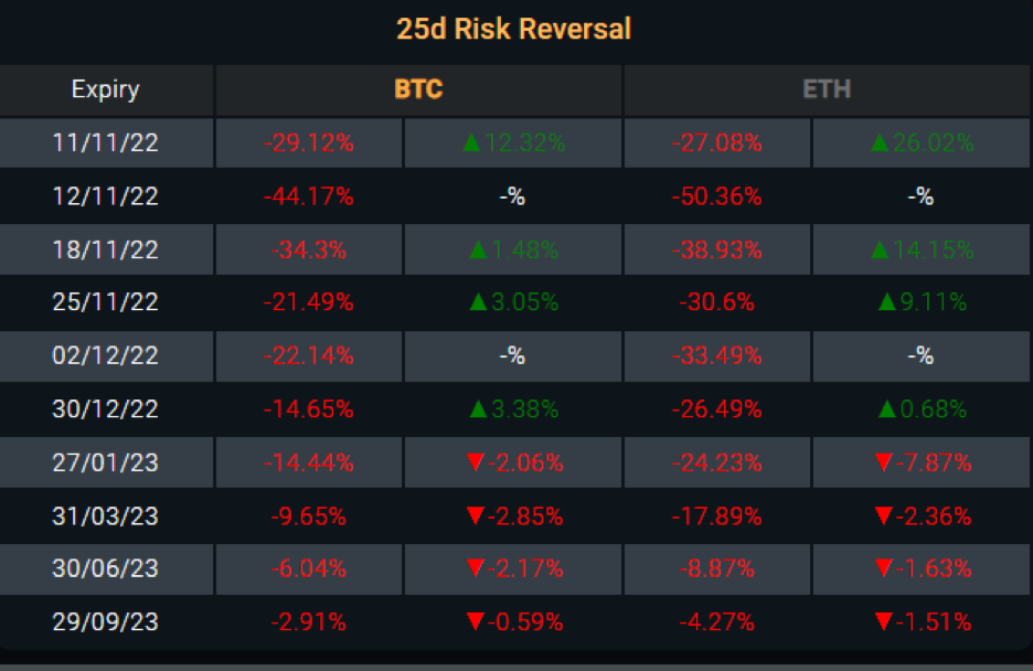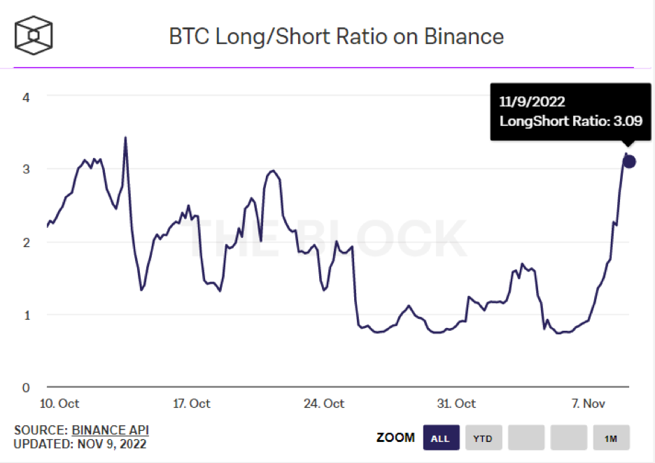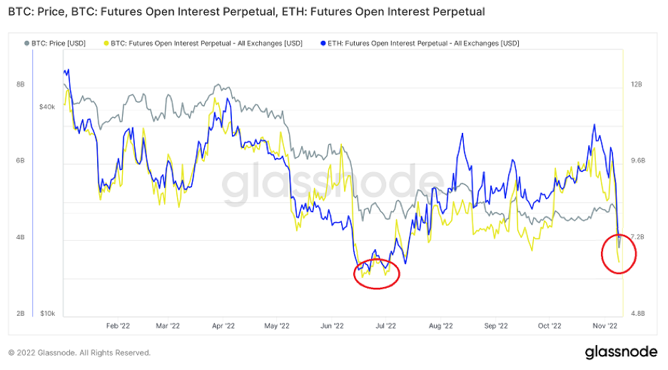 Otvorený záujem perpetuálnych futuritných kontraktov bitcoinu sa medzitýždenne znížil o 30 percent, z 9,3 miliardy dolárov 4. novembra na 6,5 miliardy dolárov 9. novembra. Zaujímavé je, že otvorený záujem perpetuálnych futuritných kontraktov etherea zaznamenal väčší pokles – o 38 percent, z 6,4 miliardy dolárov 4. novembra na 4 miliardy dolárov 9. novembra. To signalizuje potenciálny reset štruktúry trhu – podobne ako v období júla 2022. V roku 2022 bol klesajúci otvorený záujem perpetuálnych futuritných kontraktov vedúcim ukazovateľom krátkodobého tlaku na pokles.
