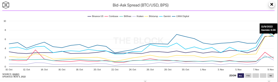 Rozptyl ponuky a dopytu (bid-ask spread) je rozdiel medzi najlepším dopytom a najlepšou ponukou na akomkoľvek trhu. Rozptyl je ukazovateľom likvidity – čím nižší je, tým lepšie pre obchodníkov. Tento graf zobrazuje denný kĺzavý priemer na páre BTC/USD na rôznych burzách. Rozptyly pre pár BTC/USD sa od začiatku roka rozšírili najviac, keďže odstránenie jedného z dlhoročných tvorcov trhu s kryptomenami FTX/Alameda spôsobuje neistotu a tlak na aktuálnu likviditu. To v krátkodobom horizonte vyvolalo stres v oblasti likvidity, čo sa prejavilo nárastom rozptylu ponuky a dopytu, ktorý je konzistentný naprieč burzami.