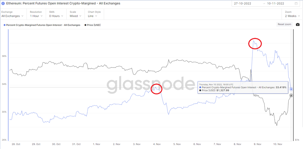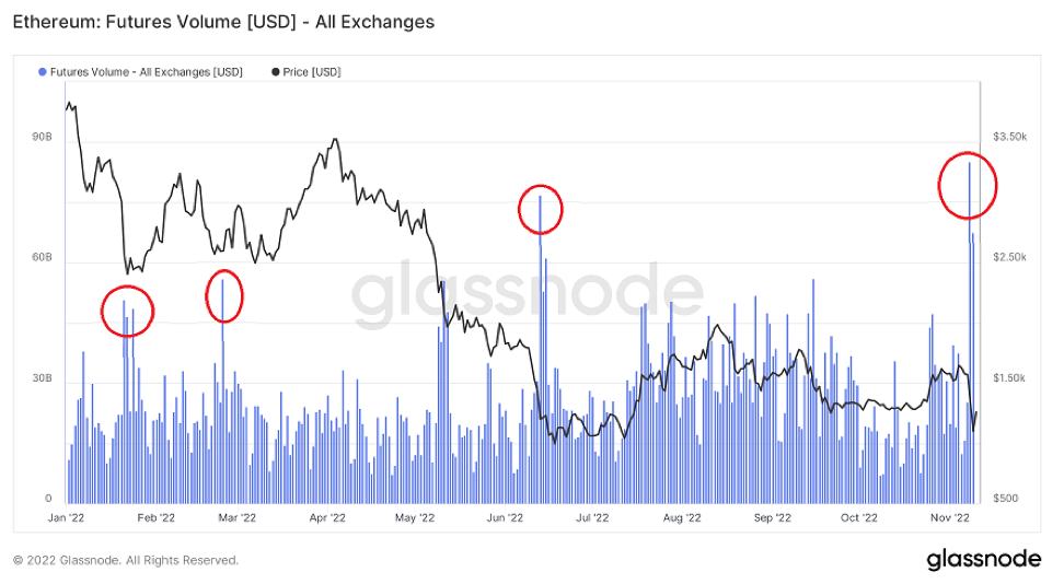 Nedávny prepad trhu sa kladne prejavil aj na reťazci, keďže objem futuritných kontraktov etherea voči doláru zaznamenal nové ročné maximá. Najmä 8. novembra sa zaznamenal celkový objem futuritných kontraktov vo výške 85 miliárd dolárov, čím sa prekonalo 76 miliárd dolárov z 13. júna a 55 miliárd dolárov z 11. mája. Všetky tieto prípady sa vyznačovali zvýšenou úrovňou nútených predajov, ktoré v konečnom dôsledku resetovali štruktúru trhu, keďže došlo k vyplaveniu prebytočných finančných pák.