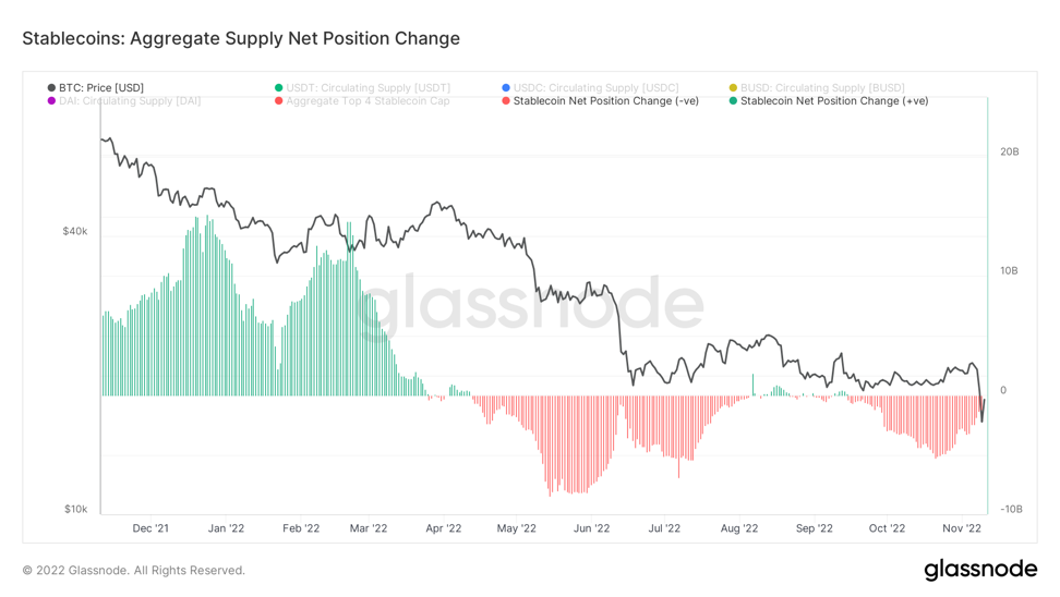 Vyššie uvedený graf zobrazuje 30-dňovú čistú zmenu ponuky štyroch hlavných stablecoinov USDT, USDC, BUSD a DAI v smart kontraktoch. Pre kontext, toto sa interpretuje ako kladná hodnota 🟢, keď sa 30-dňová celková ponuka stablecoinov rozšírila, a záporná hodnota 🔴, keď sa zmenšila. Od októbra dochádza k sústavnému znižovaniu celkovej ponuky stablecoinov, keďže kapitál opúšťa ekosystém. Najmä za posledný týždeň došlo zhruba k 4 miliardám dolárov čistého denného zníženia, čo signalizuje klesajúcu likviditu. To zase historicky viedlo k vyšším rozpätiam, a to na DeFi aj na centralizovaných burzách. To bolo v minulosti tiež negatívne alebo čiastočne neutrálne pre cenu, keďže to signalizuje odchod kapitálu z ekosystému.