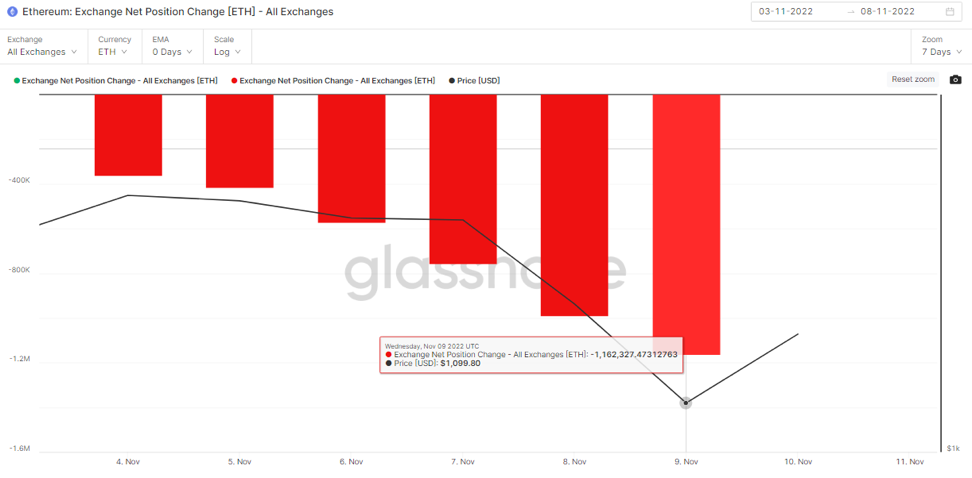 Za posledný týždeň sa zvýšil počet výberov etherea z búrz. Najmä 9. novembra, keď sa všeobecne zvýšili obavy o bezpečnosť búrz, odišlo z búrz 1,16 milióna ETH (1,4 miliardy dolárov). Z historického hľadiska obdobia zvýšenej úrovne výberov podporovali cenu. To signalizuje, že burzy naďalej vyčerpávajú svoje rezervy, ktoré majú tendenciu dopĺňať pri očakávaní býčieho trhu.