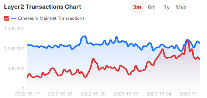 Layer-2 je termín používaný pre riešenia vytvorené na pomoc pri škálovaní aplikácií spracúvaním transakcií mimo hlavnej siete Ethereum (ktorá je Layer-1), pričom sa zachovávajú rovnaké bezpečnostné opatrenia a decentralizácia ako v hlavnej sieti. Aktivita transakcií na Layer-2 sieťach dosiahla nedávno, 8. novembra, vrchol na úrovni 1,2 milióna transakcií denne, čím sa vyrovnala vtedajšej sieti Ethereum. Odvtedy sa úroveň Layer-2 transakcií znížila spolu s celkovou likviditou trhu, keďže denný objem Layer-2 transakcií významne klesol – z 1,2 milióna na 750 000. Denné objemy transakcií na sieti Ethereum sa znížili nepatrne, z 1,2 milióna na 1,06 milióna.