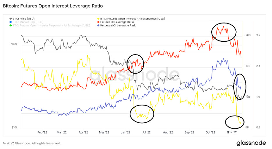 Pomer otvoreného záujmu (OI) futuritných kontraktov s finančnou pákou odhaduje stupeň pákového efektu futuritných kontraktov, ktorý existuje v pomere k veľkosti trhu, ako ukazovateľ toho, či sú trhy s derivátmi zdrojom rizika zbavovania sa finančnej páky. Treba poznamenať, že vysoké hodnoty naznačujú, že OI na trhu s futuritnými kontraktmi je v pomere k veľkosti trhu veľký. To zvyšuje riziko krátkeho nárastu/dlhého poklesu (short squeeze/long squeeze), znižovania pákového efektu alebo likvidačnej kaskády. Zatiaľ čo nízke hodnoty naznačujú, že OI na trhu s futuritnými kontraktmi je v pomere k veľkosti trhu malý. To sa vo všeobecnosti zhoduje s nižším rizikom volatility a nútených nákupov/predajov vedených derivátmi. Prípady znižovania finančnej páky, ako sú krátke nárasty/dlhé poklesy alebo likvidačné kaskády, možno identifikovať podľa rýchleho poklesu OI v pomere k trhovej kapitalizácii a vertikálnych poklesov v metrike. Toto sa odohralo v priebehu minulého týždňa, keď došlo k súbehu poklesov v rámci OI futuritných kontraktov, OI futuritných kontraktov s finančnou pákou a OI perpetuálnych futuritných kontraktov s finančnou pákou. V polovici novembra došlo v štruktúre trhu k významnému vyplavovaniu finančnej páky, čím sa napravila anomália v štruktúre trhu z júla 2022: obdobie, keď OI futuritných kontraktov s finančnou pákou pokračoval v raste napriek poklesu OI futuritných kontraktov. Vtedy to signalizovalo zvýšené riziko zbavovania sa finančnej páky.