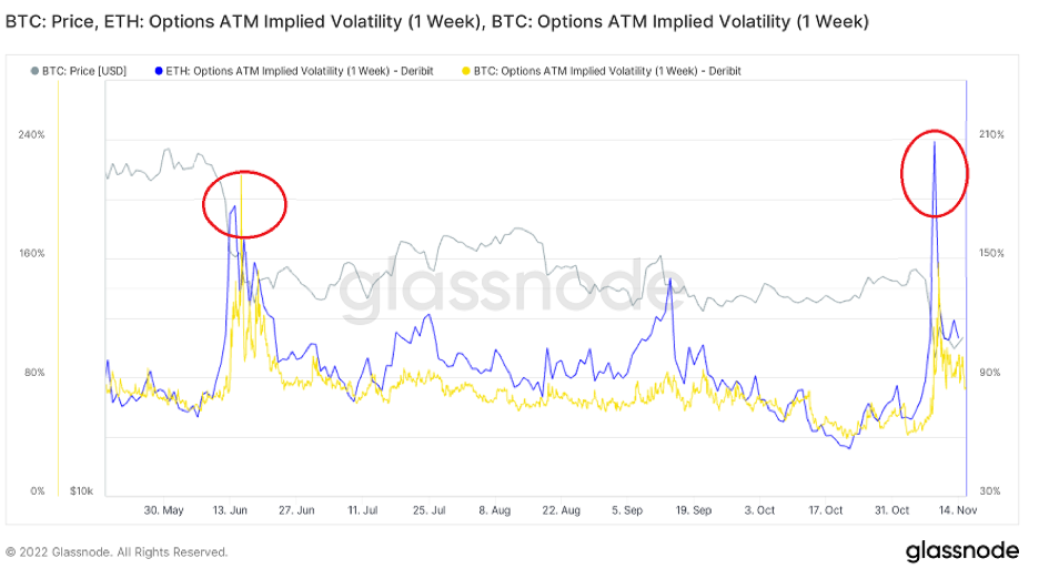 Implikovaná volatilita (IV) je výhľadová metrika derivátov určená na posúdenie toho, aký volatilný môže byť trh v budúcnosti pre dané aktívum. Vysoká IV signalizuje, že nás čaká veľký cenový výkyv, zatiaľ čo nízka IV signalizuje cenovú stabilitu. IV funguje aj ako rozhodujúci náhradný ukazovateľ hodnoty opcie, keďže čím vyššia je IV, tým vyššia je opčná prémia. Keďže väčšina objemu obchodovania s opciami sa zvyčajne uskutočňuje s ATM opciami, práve tieto kontrakty sa zvyčajne používajú na výpočet IV. Aktuálne IV pre krátkodobé opcie bitcoinu (s expiráciou do 7 dní) sa preto nedávno prepadli, keď klesli o -53 percent zo 156 vol. zo dňa 9. novembra na 72 vol. zo dňa 15. novembra. Tento pohyb bol konzistentný aj v prípade etherea, keďže IV 1-týždňových opcií zaznamenali podobný pokles o -55 percent, keď 1-týždňové lehoty splatnosti (tenor) klesli z 209 vol. dňa 9. novembra na 94 vol. dňa 15. novembra. Od začiatku roka slúžili veľké poklesy 1-týždňovej ATM volatility ako predbežný ukazovateľ zvratu v nálade na trhu.