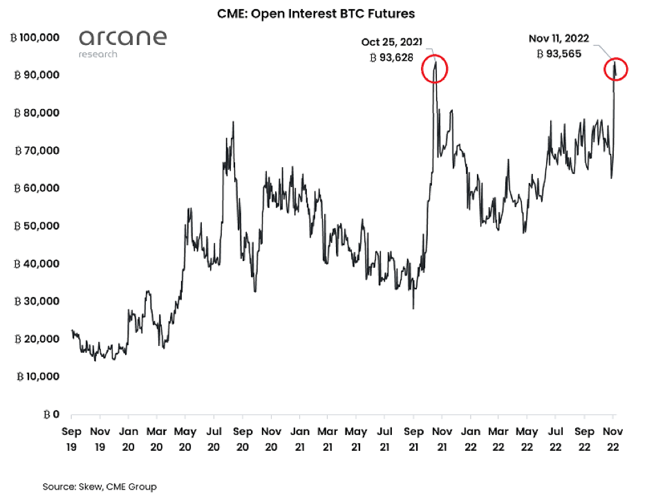 Inštitucionálni obchodníci sú späť, ale nie tak ako v roku 2020. Otvorený záujem na CME bol v piatok ekvivalentný 93 565 BTC, čo predstavuje druhý najvyšší zaznamenaný otvorený záujem futuritných kontraktov bitcoinu na CME vôbec, len za maximom 93 630 BTC po spustení BITO 25. októbra 2021. Všetky údaje naznačujú, že obchodníci CME výrazne predávajú krátke pozície bitcoinu (shorting), keďže termínová štruktúra (výnosová krivka) futuritných kontraktov je v backwardácii – decembrové kontrakty sa v súčasnosti obchodujú na úrovni -1 percento pod novembrovými kontraktmi. Pre kontext, toto sa považuje za extrémny diskont voči spotovej cene, pretože súčasné diskonty sú väčšie ako diskonty po kolapse bitcoinu z 12. marca 2020.
