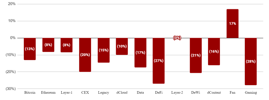 Platformy smart kontraktov, základné vrstvy decentralizovanej činnosti, vo všeobecnosti za posledný mesiac utrpeli menej ako všetky ostatné sektory, pričom Layer-1 siete klesli o 8 percent. Kríza sa zhodovala s nárastom aktivity Layer-2 sietí, vďaka čomu sa hodnotenie Layer-2 sietí po týchto udalostiach nepoškodilo a odráža rastúci dopyt po riešeniach na škálovanie blockchainov.