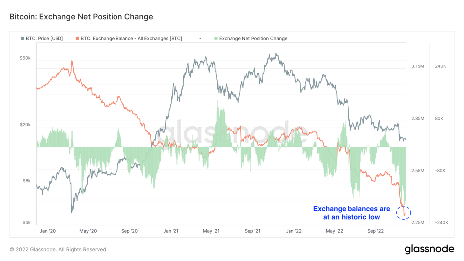 V posledných týždňoch sa z búrz presunulo viac BTC ako kedykoľvek predtým v histórii protokolu. Burzy na celom svete zažívajú obrovské výbery kryptomien zo svojich pokladníc, pričom väčšina investorov presúva svoje bitcoiny do peňaženiek s vlastnou úschovou, ako je napríklad offline BTC peňaženka Numbrs Personal Finance. Mať kontrolu nad vlastným majetkom je dôležitá vlastnosť kryptomien, ktorá sa zdá v rozpore s burzami, tie nielenže uchovávajú vaše prostriedky, ale používajú vaše kryptomeny tak, ako to robia banky v súčasnom bankovom systéme s frakčnými rezervami. Burzy zaznamenali jeden z najväčších čistých poklesov súhrnnej bilancie BTC v histórii, keď za týždeň po 8. novembri klesli o 72,9 tisíca BTC. K podobným poklesom na burzách došlo v minulosti len trikrát: Apríl 2020, november 2020 a jún až júl 2022.