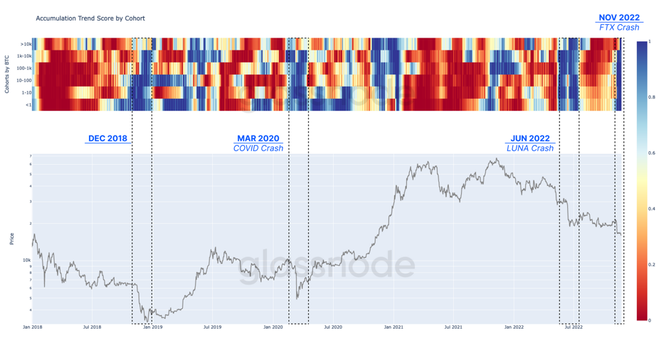 Minulé medvedie obdobia v histórii bitcoinu ukazujú veľmi podobnú štruktúru trhu, pokiaľ ide o súčasné akumulačné správanie investorov. Pri pohľade na obdobie od decembra 2018 do marca 2020 vidno, že investori už vtedy využívali náročné trhové podmienky a udalosti typu čierna labuť na doplnenie svojich peňaženiek – presne tak, ako to robia teraz. Bitcoin počas svojej relatívne krátkej histórie prežil mnoho ťažkých období. Aj keď sa súčasná situácia na FTX zdá neudržateľná, sieť BTC naďalej preukazuje silu a odolnosť počas tých najtemnejších období v histórii bitcoinu.