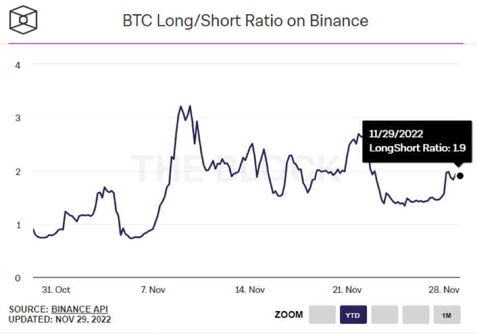 Krátkodobý výhľad: Krátkodobý výhľad máme neutrálny, keďže pozícia futuritných kontraktov je naklonená býčím smerom, čo je kompenzované pokračujúcim predajným tlakom zo strany ázijského regiónu. Po kolapse FTX zostáva ázijský región kľúčovým hráčom v oblasti derivátov, keďže čínske burzy Binance, OKX a Bybit predstavujú viac ako 85 percent objemu obchodovania s futuritnými kontraktmi. Dáta na reťazci ukazujú, že Ázia v posledných dňoch po mesiacoch hromadenia začala predávať ethereum a zostáva za posledný mesiac čistým predajcom bitcoinu. Medvedí sklon ako taký sa pripisuje najmä nedávnej divergencii Ázie. V polovici novembra došlo v štruktúre trhu k zbavovaniu sa pákového efektu s významným znížením naprieč otvoreným záujmom a otvoreným záujmom s finančnou pákou.