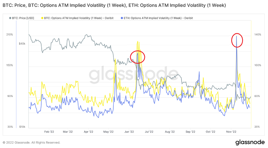 Implikovaná volatilita (IV) je výhľadová metrika derivátov vytvorená na posúdenie toho, aký volatilný môže byť trh v budúcnosti pre dané aktívum. Vysoká implikovaná volatilita signalizuje, že nás čaká veľký cenový výkyv, zatiaľ čo nízka IV signalizuje cenovú stabilitu. IV funguje aj ako rozhodujúci náhradný ukazovateľ hodnoty opcií, pretože čím vyššia je IV, tým vyššia je opčná prémia. Keďže väčšina objemu obchodovania s opciami sa zvyčajne uskutočňuje s ATM opciami (at-the-money), práve tieto kontrakty sa zvyčajne používajú na výpočet IV. Aktuálne implikované voľatility pre krátkodobé opcie bitcoinu (s expiráciou do 7 dní) ako také mali za posledný týždeň klesajúci trend, keď sa znížili o 37 percent zo 79 vol. 21. novembra na 50 vol. 29. novembra. Tento pohyb bol konzistentný aj v prípade etherea, keďže implikované volatility 1-týždňových opcií sa znížili o 25 percent, pričom 1-týždňové opcie klesli z 94 vol. 21. novembra na 70 vol. 29. novembra.