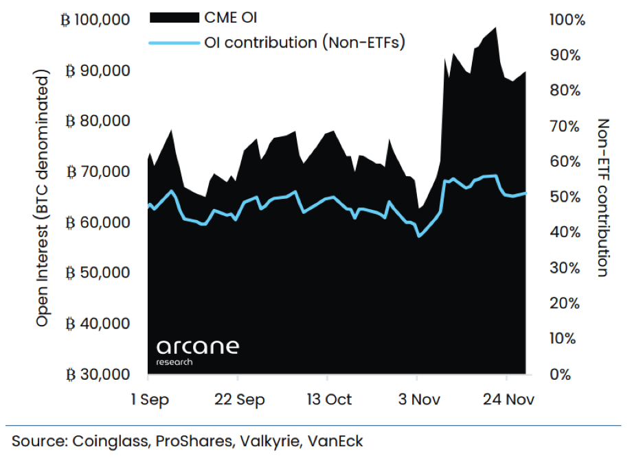 Inštitucionálna nálada a pozícia na burze CME naďalej vykazujú medvedí trend. Najmä otvorený záujem na burze CME sa v novembri zvýšil na 89 955 BTC, čo predstavuje medzimesačný nárast o 30 percent. Treba poznamenať, že po spustení BITO 25. októbra 2021 súčasná úroveň otvoreného záujmu na burze CME zostáva zvýšená – druhá najvyššia v histórii, pričom ATH úroveň bola 93 630 BTC. Všetky údaje naznačujú, že obchodníci na burze CME intenzívne shortujú bitcoin (predávahú požičané bitcoiny s cieľom zárobku pri budúcom poklese ceny), lebo termínová štruktúra futuritných kontraktov je v hlbokej backwardácii (cena futuritných kontraktov je nižšia ako očakávaná realizačná cena pri konci splatnosti) – decembrové kontrakty sa v súčasnosti obchodujú na úrovni -1 percento pod úrovňou novembrových kontraktov. Toto sa považuje za extrémny diskont voči spotovému obchodovaniu, pretože súčasné diskonty sú väčšie ako tie po kolapse bitcoinu z 12. marca 2020.