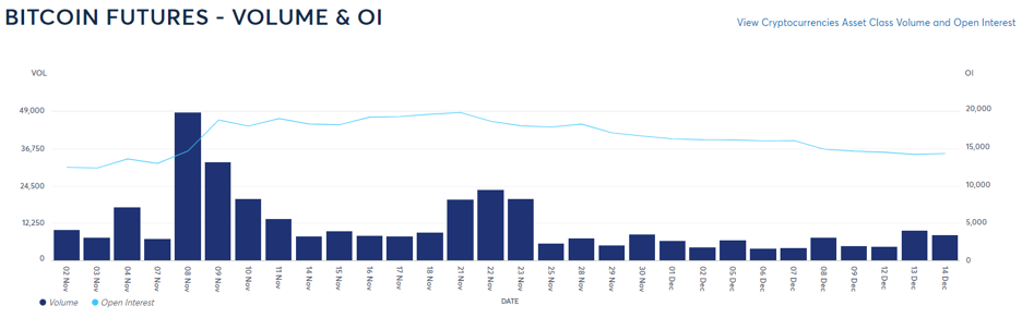 Burza CME zaznamenala zvýšené objemy a úrovne otvoreného záujmu počas krachu FTX začiatkom novembra. Odvtedy zostal otvorený záujem futuritných kontraktov bitcoinu stabilný, pričom sa mierne znížil z 30-dňového maxima 14 439 kontraktov BTC 8. novembra na 14 110 kontraktov 14. decembra. Všetky údaje naznačujú, že obchodníci na burze CME výrazne shortujú bitcoin, keďže termínová štruktúra futuritných kontraktov zostáva v backwardácii (cena futuritných kontraktov je nižšia ako očakávaná realizačná cena pri konci splatnosti).