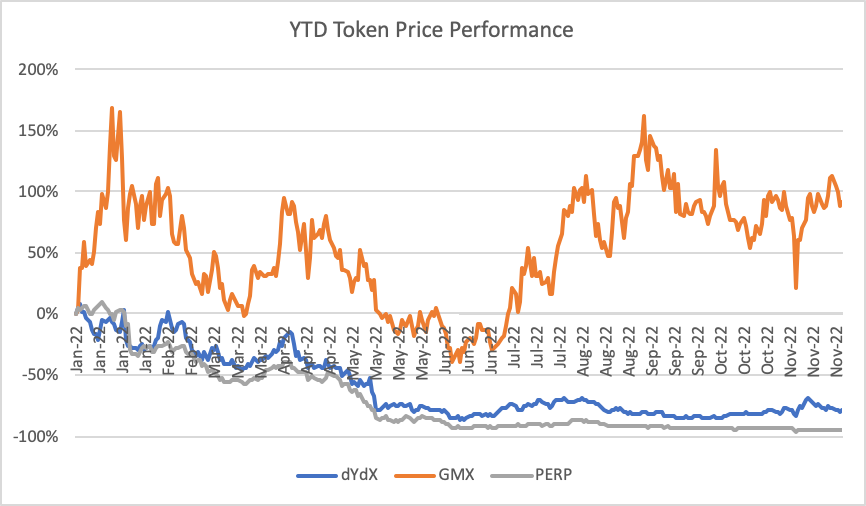 Burza GMX dosiahla od začiatku roka výnos 92 percent a prekonala tak celkový trh, ako aj svoju kohortu. GMX počas celého roka rozširovala svoju používateľskú základňu, obchodné objemy a výnosy a mala menší previs ponuky ako jej rovesníci, pričom jej pomer CMC/FDV bol vyšší.