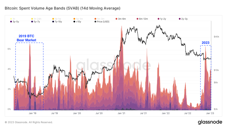 Počas býčích a medvedích trhov sa počet CDD môže dramaticky zvýšiť, najmä na začiatku býčích trhov a uprostred medvedích trhov. Je to spôsobené tým, že staršie mince sa míňajú - čím sa efektívne vynulujú ich hodnoty CDD. Tmavé časti na grafe SVAB predstavujú obdobia, keď bol zvýšený dopyt po BTC (býčie rely) alebo nedostatočné zníženie presvedčenia v protokole. Napríklad na medveďom trhu v roku 2019 sa vyskytli veľké špičky CDD po päť- až sedemročné vekové pásma. Veľké množstvá CDD sa stratili aj na začiatku býčej rely viditeľnej na konci roka 2020. Na súčasnom trhu boli pozorované veľké špičky CDD – najmä v troch- až päťročných vekových pásmach. Predchádzajúci výskum vyčlenil rast týchto špičiek, a teraz je zrejmé, že sa objavil trend predaja starších mincí. Ako už bolo spomenuté v tomto článku, medvedie trhy sa končia, keď už nie sú žiadni predajcovia. Ak zo starších peňaženiek začne prúdiť čoraz viac BTC, je pravdepodobné, že cena BTC bude naďalej klesať, kým nedôjde k zmene nálady na trhu.