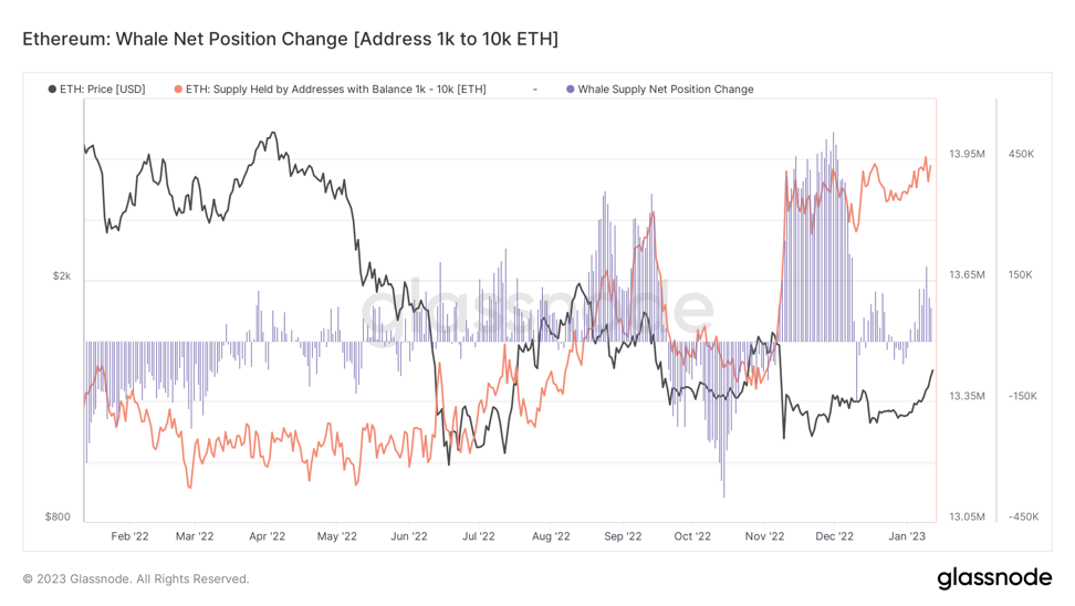 V roku 2023 ETH veľryby akumulujú, keďže krátkodobé riziká negatívneho vplyvu kolapsu burzy FTX klesajú. Inštitucionálna nákupná aktivita zostáva v rámci zdravých úrovní a nepovažuje sa za rozšírenú. Údaje z reťazca ukazujú, že veľryby majú o budúcnosti kryptomien dlhodobo najvyššie presvedčenie, pričom zrýchlenie nákupov vedie v najbližších mesiacoch k potenciálnemu ponukovému šoku smerom nahor.