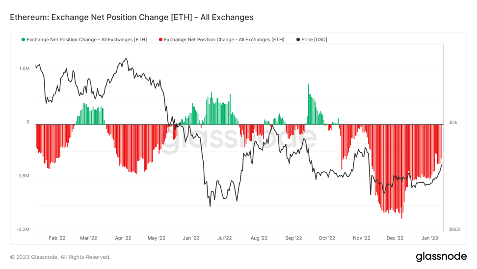 V novom roku pokračuje trend z konca 4. štvrťroka, keď sa z centralizovaných búrz sťahovali zvýšené množstvá etherea. Konkrétne 12. januára z búrz odišiel 1 milión ETH (1,4 miliardy dolárov) po rekordných úrovniach výberov z búrz začiatkom decembra, keď bolo vybratých 2,7 milióna ETH (3,2 miliardy dolárov). Z historického hľadiska obdobia zvýšených úrovní výberov podporujú cenu, keďže denný predajný tlak ustupuje.