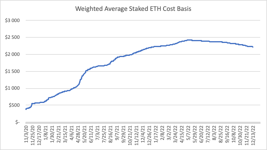 Krátkodobé vplyvy na Ethereum L1: Uprednostnenie stakingových výberov bude mať vplyv na účasť na stakingu, ale v akom smere? K 13. decembru je v stakingu 15,6 milióna ETH, čo predstavuje mieru účasti na stakingu 12,9 percenta. Na základe záverečnej ceny ETH pri stakingu nového ETH môžeme vypočítať pomocou váženého priemeru cenovú základňu stakovaného ETH v danom čase.