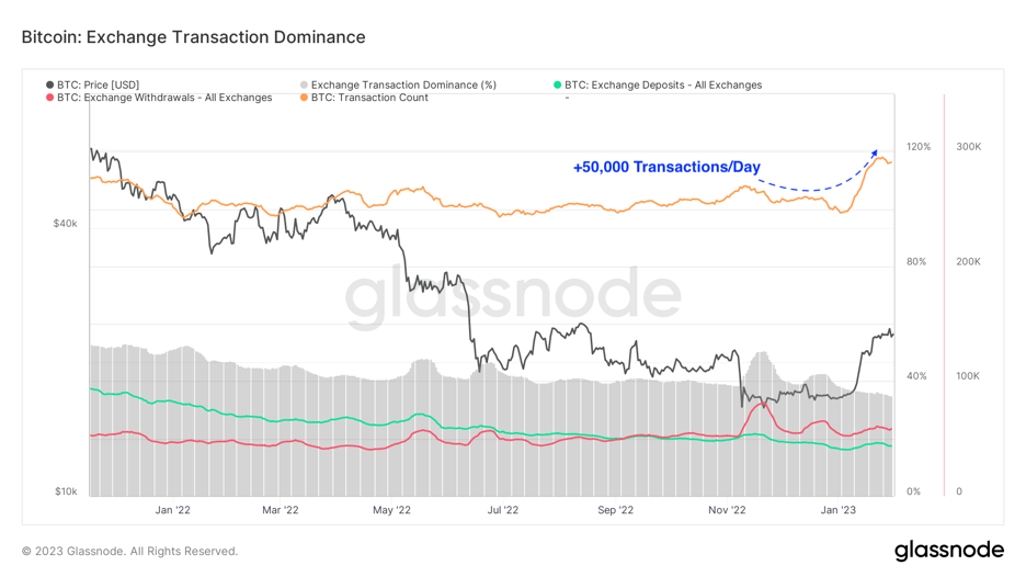 Objem transakcií sa zvýšil spolu s cenou. Až do poslednej tretiny januára sa počet transakcií vyrovnal a trh BTC bol utlmený nízkou aktivitou. Nedostatok aktivity sa pravdepodobne pripisoval dovolenkovej sezóne, keďže mnoho obchodníkov a inštitúcií je ku koncu roka neaktívnych. Približne od polovice januára sa objemy transakcií zvýšili o 20 percent, čo predstavuje nárast približne o 40- až 50-tisíc transakcií denne. Na porovnanie, v čase vrcholu býčích trhov môžu objemy transakcií presiahnuť 350 000 transakcií za deň. To trochu tlmí vyhliadky, ale skutočne to ukazuje, že sieť Bitcoin sa prebúdza.