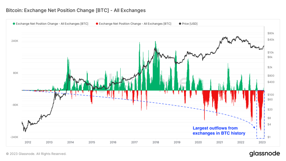 V januári došlo k historickému odlevu bitcoinov z búrz, pričom v niektorých dňoch sa z búrz presunulo takmer 200 000 BTC do vlastného úložiska. Tieto odlevy sa dajú ľahko spozorovať na metrike Zmeny čistej pozície na burzách (Exchange Net Position Change) a znamenajú zreteľný trend zvyšovania objemu bitcoinov odchádzajúcich z účtov na burzách, ktoré sa vytvárali od samého začiatku existencie protokolu Bitcoin. Odlevy sa v posledných dňoch znížili o viac ako 90 percent, keďže cena sa zvyšuje, pričom denne sa z búrz presúva od 5 000 do 20 000 BTC.