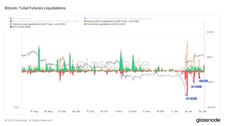 Keď sa trh s bitcoinmi alebo akýkoľvek iný trh dlhodobo nakláňa určitým smerom, obchodníci na trhu sa často ocitnú na nesprávnej strane, keď nastane trhový pohyb, a tlačia trhovú náladu opačným smerom. Keď sa začal rok 2023, obchodníci s derivátmi bitcoinu boli nastavení na pokračovanie medvedieho trendu, ktorý bol zakotvený v kolektívnej psychológii trhu počas celého roka 2022. Keď v polovici januára zasiahli trhy pozitívne správy o znížení inflácie, spotové trhy sa napli a vytlačili cenu dostatočne vysoko na to, aby sa krátke pozície rozpadli. Keďže obchodníci s krátkymi pozíciami boli nútení nakupovať spotový BTC, aby pokryli svoje pozície, cena prudko vzrástla.