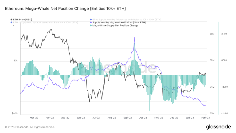 Megaveľryby etherea v posledných týždňoch vykazujú známky vyčerpania predajcov. Najmä subjekty, ktoré držia 10 000 alebo viac ETH, zaznamenali pokles predajného tlaku. To znamená, že čistý predaj sa znížil z 1,6 milióna ETH (2,6 miliardy dolárov) v novembri 2022 na 600-tisíc ETH (1 miliarda dolárov) k 1. februáru. Všimnite si, že vrchol predajného tlaku nastal v novembri, keďže počas kolapsu FTX došlo k historickej úrovni likvidácie. Odvtedy si cena v nasledujúcich mesiacoch našla spodnú hranicu, pričom februárová aktivita signalizuje zlepšenie nálady investorov.