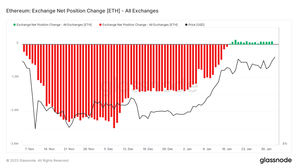 V januári došlo k obratu tokov na burzách z maxima -2,8 milióna ETH (4,4 miliardy dolárov) v decembri 2022 na +110 tisíc ETH (183 miliónov dolárov) na začiatku februára. To signalizuje mierne zvýšenie potenciálneho krátkodobého predajného tlaku, keďže používatelia vymieňajú ethereum za altcoiny alebo stablecoiny. Pripisuje sa to najmä tomu, že ethereum je naďalej kľúčovým zdrojom likvidity altcoinov ako druhý alebo tretí najlikvidnejší trh po obchodných pároch denominovaných v stablecoinoch. V praxi ethereum slúži ako fixný bod hodnoty a de facto reverzná mena pre altcoinovú likviditu, a to na centralizovaných aj decentralizovaných burzách.