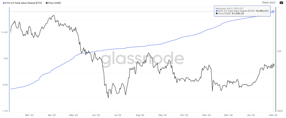 Vývojári etherea stanovili marec 2023 na ďalší hardfork s názvom "Šanghaj". Táto aktualizácia bude obsahovať EIP 4895, aktualizáciu kódu, ktorá umožní výbery pre stakované ethereum na reťazci Beacon Chain. Predbežný časový plán zavádza funkciu, ktorá chýbala od spustenia stakingu ETH2 v decembri 2020. Pri posudzovaní predajného tlaku tím ešte musí vytýčiť množstvo, ktoré je k dispozícii na ľahké odstakovanie. V podstate má reťazec Beacon Chain v držbe 16,38 milióna ETH v hodnote 26,9 miliardy dolárov. Príležitosť na rast bola jasná – vlastniť percentuálny podiel v sieti. Ponuka etherea v obehu vo výške 120,5 milióna má za následok aktuálny stakingový pomer na úrovni 14 percent, čo je najmenej spomedzi Layer-1 sietí. Vyššie uvedený graf ukazuje zdravý rast stakingu v priebehu roka 2022, čo napomáha dlhodobé presvedčenie napriek potenciálnym záchvatom predajného tlaku okolo odomknutia stakingu v marci 2023.