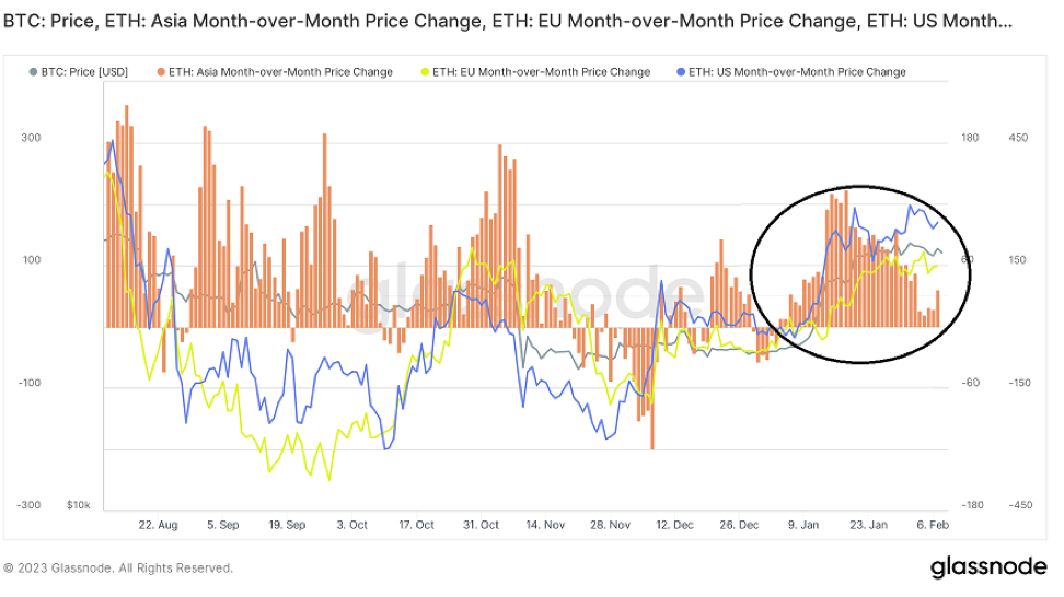 Súbeh spotových nákupov v troch regiónoch je zriedkavým javom, ktorý slúži ako hlavný ukazovateľ stability cien a potenciálneho pohybu smerom nahor. Vzhľadom na význam ázijského regiónu údaje na reťazci ukazujú, že cena je oveľa citlivejšia na zmeny v nálade ázijských investorov. Ázijský región akumuluje od novembrového výbuchu FTX, pričom USA a EÚ ho nasledujú. Súbeh spotových nákupov naprieč regiónmi ako taký signalizuje aj vyčerpanie predajcov.