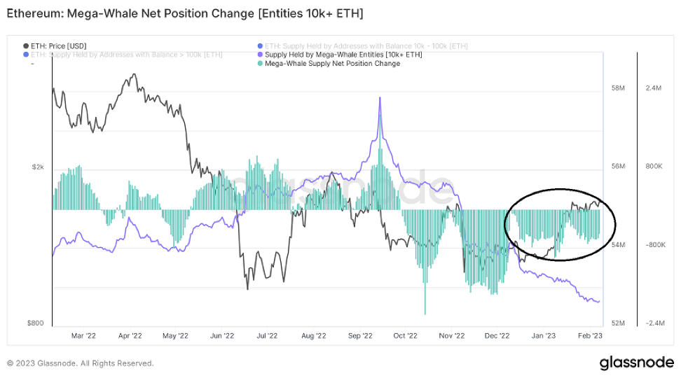 Megaveľryby etherea v posledných týždňoch vykazujú známky vyčerpania predajcov. Najmä subjekty, ktoré držia 10 000 alebo viac ETH, zaznamenali pokles predajného tlaku. To znamená, že čistý predaj sa znížil z 1,6 milióna ETH (2,65 miliardy dolárov) v novembri 2022 na 495 tisíc ETH (820 miliónov dolárov) k 1. februáru. Všimnite si, že vrchol predajného tlaku nastal v novembri, keďže počas kolapsu FTX došlo k historickej úrovni likvidácie. Odvtedy si cena v nasledujúcich mesiacoch našla spodnú hranicu, pričom februárová aktivita signalizuje zlepšenie nálady investorov.
