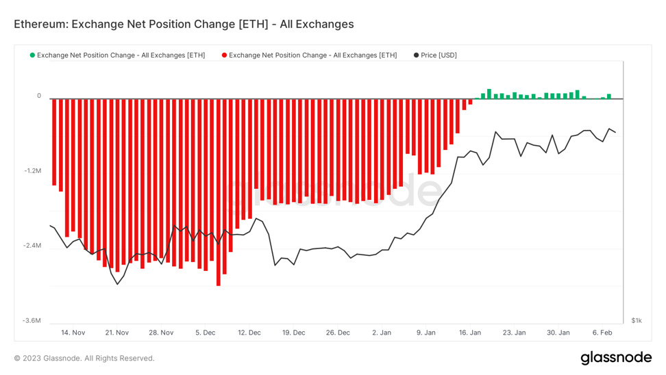 V januári došlo k obratu tokov na burzách z maxima -2,8 milióna ETH (4,6 miliardy dolárov) v decembri 2022 na +85 tisíc ETH (140 miliónov dolárov) na začiatku februára. To signalizuje mierne zvýšenie potenciálneho krátkodobého predajného tlaku, keďže používatelia vymieňajú ethereum za altcoiny alebo stablecoiny. Pripisuje sa to najmä tomu, že ethereum je naďalej kľúčovým zdrojom likvidity altcoinov ako druhý alebo tretí najlikvidnejší trh po obchodných pároch denominovaných v stablecoinoch. V praxi ethereum slúži ako fixný bod hodnoty a de facto reverzná mena pre altcoinovú likviditu, a to na centralizovaných aj decentralizovaných burzách.