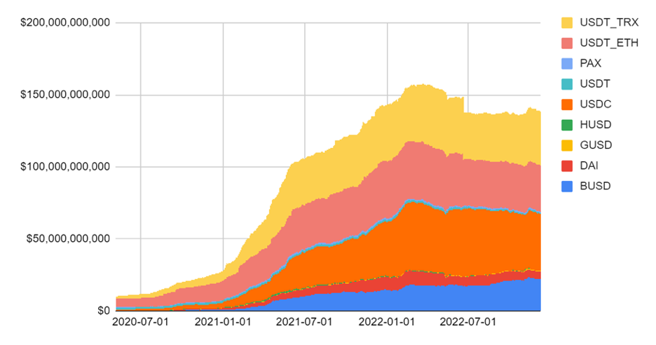 Stablecoiny sú kľúčovou súčasťou decentralizovanej ekonomiky, pretože uľahčujú transakcie a financovanie v jednotke hodnoty, ktorá je naviazaná na hodnotu v tradičnej ekonomike. To umožňuje používateľom využívať výhody špičkovej technológie, ktorú blockchainy ponúkajú na bankovníctvo a burzu, bez toho, aby podliehali volatilite kryptomien. Stablecoiny sú populárne v podobe zahraničných mien a komodít, ako je napríklad zlato. Takmer 140 miliárd dolárov je zabezpečených na blockchainoch vo forme stablecoinov založených na dolári. Táto hodnota je krytá vkladmi v amerických dolároch a aktívami prinášajúcimi výnosy a celková suma zostala počas celého roka relatívne stabilná. Nezabezpečené stablecoiny, ktoré sú postavené na algoritmickom generovaní, sú nezrelou triedou aktív, ktorá bola v minulom roku do veľkej miery vyradená. Významnú úlohu budú zohrávať v budúcnosti – ak a keď sa nesprávne nastavená dôvera v centrálne banky stane menej preferovanou pred matematikou bez potreby dôvery.