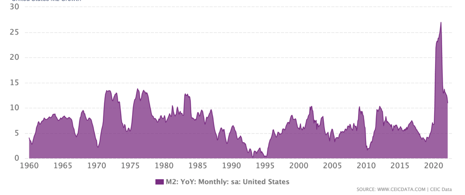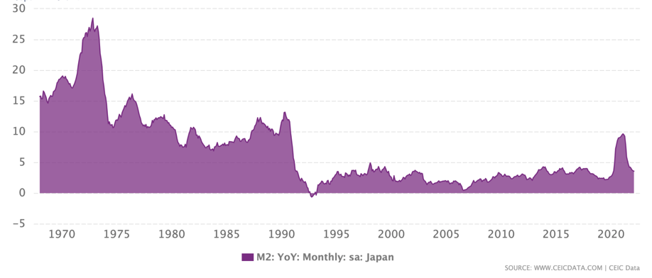Pri porovnaní rastu peňažnej zásoby M2 v Japonsku a USA (grafy 2 a 3) možno pozorovať výrazné rozdiely. Po prvé, v súlade s naším vyššie uvedeným krátkym historickým zhrnutím možno pozorovať kolaps rastu peňažnej zásoby M2 po spľasnutí japonskej bubliny aktív na začiatku 90. rokov. Následne v rokoch 1992 až 2020 dosahoval rast M2 v priemere slabých 2,6 percenta ročne. Pri pohľade na ekvivalentný americký graf možno pozorovať, že od roku 1995 do roku 2020 rast M2 zriedkavo klesol pod 5 percent, s významnou výnimkou rokov 2008 až 2010, keď sa USA nakrátko ponorili do deflácie. Celkovo sa od roku 1992 do roku 2020 ponuka M2 v Japonsku zdvojnásobila, a to z 500 biliónov jenov na niečo vyše 1 000 biliónov jenov. V tom istom období sa v USA objem M2 zvýšil päťnásobne, z 3,2 bilióna dolárov na 15,5 bilióna dolárov. Relatívne rovnomerný menový rast spolu so stagnujúcim hospodárskym rastom preto neprekvapivo viedli k nízkej inflácii a prípadom deflácie. Výsledky japonskej menovej politiky sú z monetaristického hľadiska úplne logické.