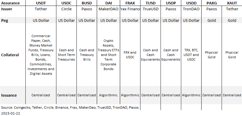 Existuje len 5 stablecoinov s ponukou v obehu, v hodnote približne 1 miliardy dolárov alebo viac, ktoré sú zabezpečené mimo reťazca hotovosťou, peňažnými ekvivalentmi a likvidnými investíciami. Patria medzi ne USDT od Tether, USDC od Circle, BUSD od Binance a Paxos, TUSD od TrueUSD a USDP od Paxos. Držanie týchto aktív vo vlastnej úschove v ich natívnej forme sa považuje za najlepšiu metódu na uchovávanie stablecoinov v blockchaine.