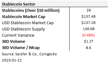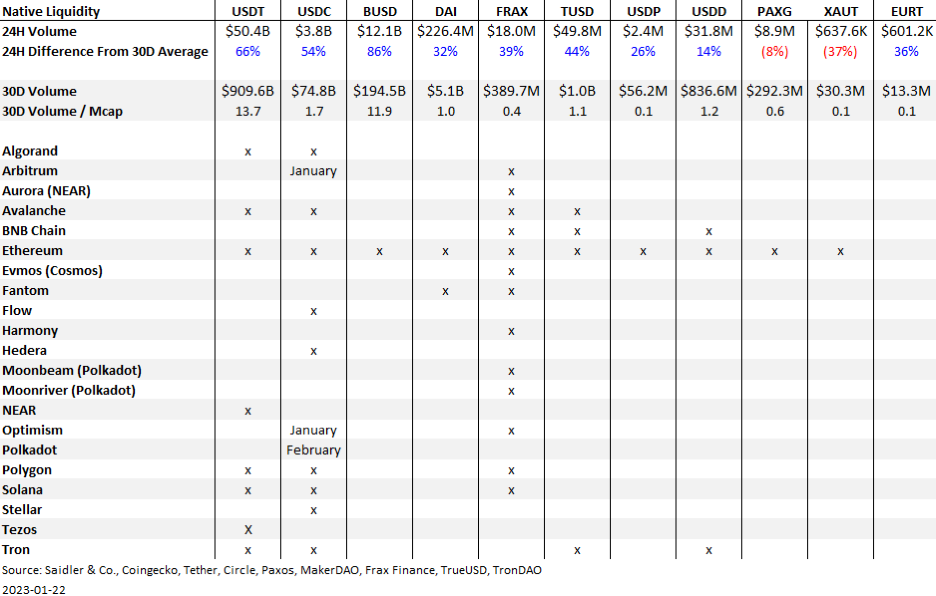 3. Likvidita meria objem obchodovania so stablecoinom a mesačnú mieru obratu meranú ako podiel 30-dňového objemu a trhovej kapitalizácie v obehu. Rozdiel medzi 24-hodinovým objemom a 30-dňovým priemerným denným objemom poskytuje predstavu o tom, čo sa na trhu deje zo dňa na deň. Zaznamenávame aj každý blockchain, na ktorom token natívne funguje bez toho, aby musel byť premostený. Premostenie aktív má za následok vystavenie sa dodatočnému riziku protistrany a smart kontraktu. Hekovanie mostov bolo v roku 2022 najväčším zdrojom zneužitia v kryptoekonomike, čo malo za následok stratu finančných prostriedkov vo výške viac ako 2 miliardy dolárov. Držanie stablecoinov na blockchainoch, kde nie sú natívne vydané, ich vystavuje ďalšiemu riziku.