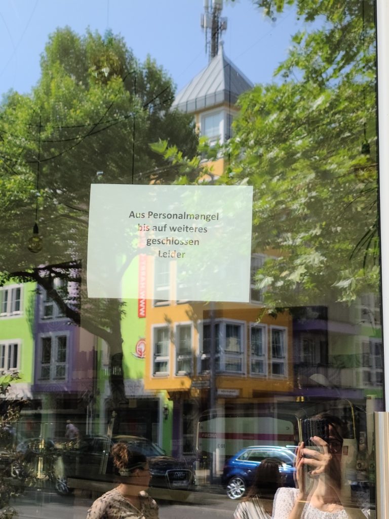 V našom dome sa zase hľadá nová firma, ktorá by prevzala správu domu, pretože doterajšia nemá dosť ľudí a prestáva to zvládať. Obľúbený pekár v susedstve má kvôli chýbajúcej pracovnej sile v pondelky zavreté a v lekárni ma nedávno poslali do inej, keďže mi nemohli namiešať masť – tiež kvôli nedostatku personálu. Dokonca ešte aj kaviareň v našej štvrti musela zavrieť na neurčito, nie kvôli malému dopytu, ale rovnako pre chýbajúcu pracovnú silu. Majiteľ našiel riešenie v tom, že je aspoň otvorené okienko, cez ktoré predáva zmrzlinu a zákusky.