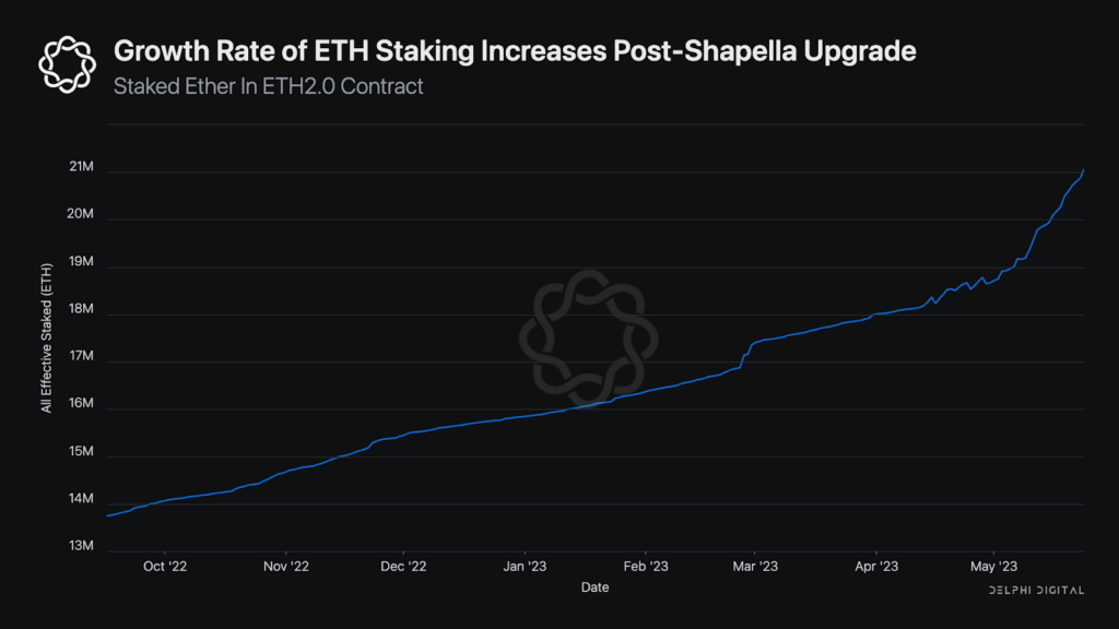 Vzostup ethereum stakingu nastal hlavne po marcovej aktualizácii siete s názvom Shapella, v rámci ktorej dostali investori možnosť uzamknuté ethery aj odomknúť. Nárast uzamknutých etherov zo 16 miliónov na 25 miliónov od marca do augusta tohto roku reprezentoval viac než 50 percent. To znamená, že zo všetkých etherov v obehu je už viac než pätina uzamknutých prostredníctvom stakingu.