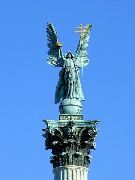 Čo tu môžeme vidieť? Predovšetkým v centrálnej pozícii na niekoľkometrovom stĺpe monumentálnu sochu Archanjela Gabriela, ktorý v pravej ruke nesie takzvanú Svätoštefanskú korunu a v ľavej dvojitý kríž, ktorými akoby posväcoval Pamätník tisícročia príchodu predkov dnešných Maďarov do Panónskej panvy.