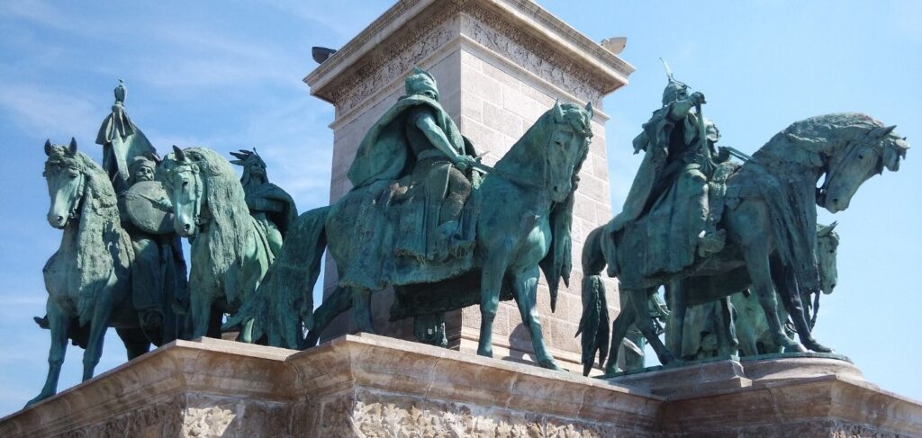 Nuž teda, keď žijeme príbehmi, pozrime sa na zhmotnené príbehy našich dvoch najbližších susedov. Zhodou okolností tých, s ktorými nás dejiny spojili na dlhší či kratší čas. Dlhšie sme žili a vlastne stále aj žijeme s Maďarmi. A hoci sme s nimi pod jednou strechou Uhorského kráľovstva pretrvali viac ako 900 rokov a nejako to dávalo zmysel, lebo až na povstanie v roku 1848/1849 sme sa proti zväzku s nimi nebúrili (rovnako ako ani oni sa nebúrili proti nám); predsa len sme si s nimi nevytvorili dodnes žiaden koncept, ktorý by ten príbeh prerozprával do jazyka prijateľného rovnako pre nich, ako pre nás. Oni si však svoju fabulu nielenže vytvorili, ale patrične ju už aj materializovali, rozumej umelecky monumentalizovali. Najviditeľnejšie na dnešnom Námestí hrdinov – Hősök tere.