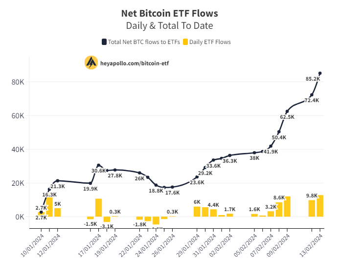 Napriek tomu sa objavuje významnejší trend. Miera akumulácie bitcoinov sa zvyšuje, pričom dva z "nových deviatich" bitcoinových ETF – IBIT a FBTC – denne absorbujú značné množstvo bitcoinov. Ich spoločný príjem predstavuje približne 9-tisíc bitcoinov denne, čo je v ostrom kontraste s 900 bitcoinami, ktoré denne vznikajú ťažbou. Napríklad len 13. februára akvizícia bitcoinov cez ETF v USA dosiahla úroveň 630 miliónov dolárov.