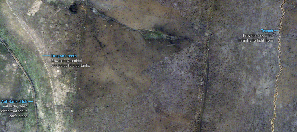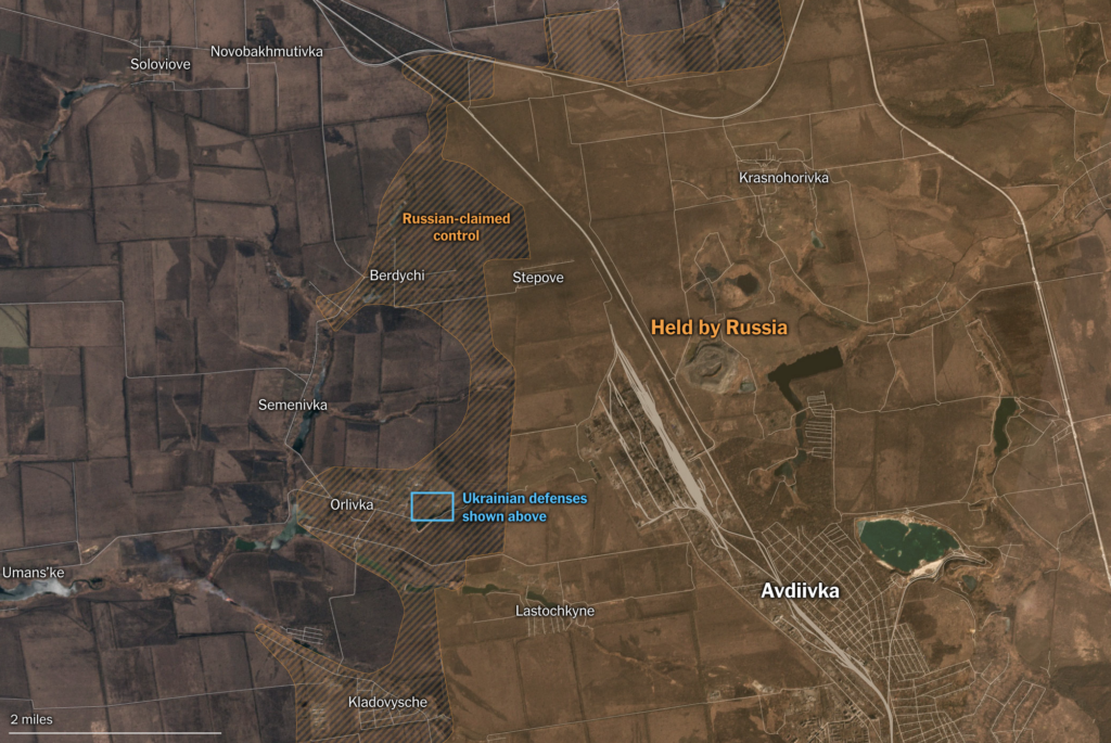 V oblasti západne od Avdijivky, ktorú sa Ukrajina snaží brániť, sa podľa analýzy snímok komerčnej satelitnej spoločnosti Planet Labs, ktorú uverejnil denník New York Times, nachádzajú riedke, jednoduché zákopové línie. Týmto zákopovým líniám chýbajú mnohé ďalšie opevnenia, ktoré by mohli pomôcť spomaliť ruské tanky a brániť hlavné cesty a dôležitý terén.