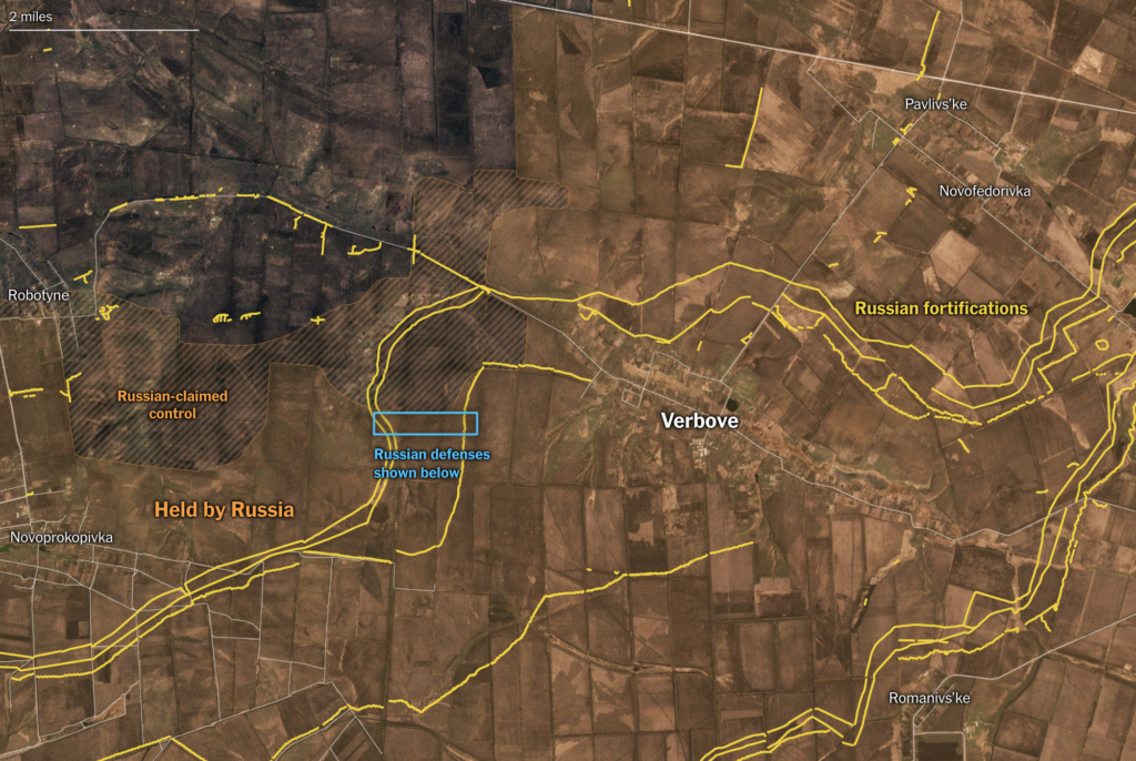 Ruské opevnenia pri južnej dedine Verbove, ktorú sa na jeseň Ukrajina neúspešne pokúsila dobyť, ukazujú niečo úplne iné.