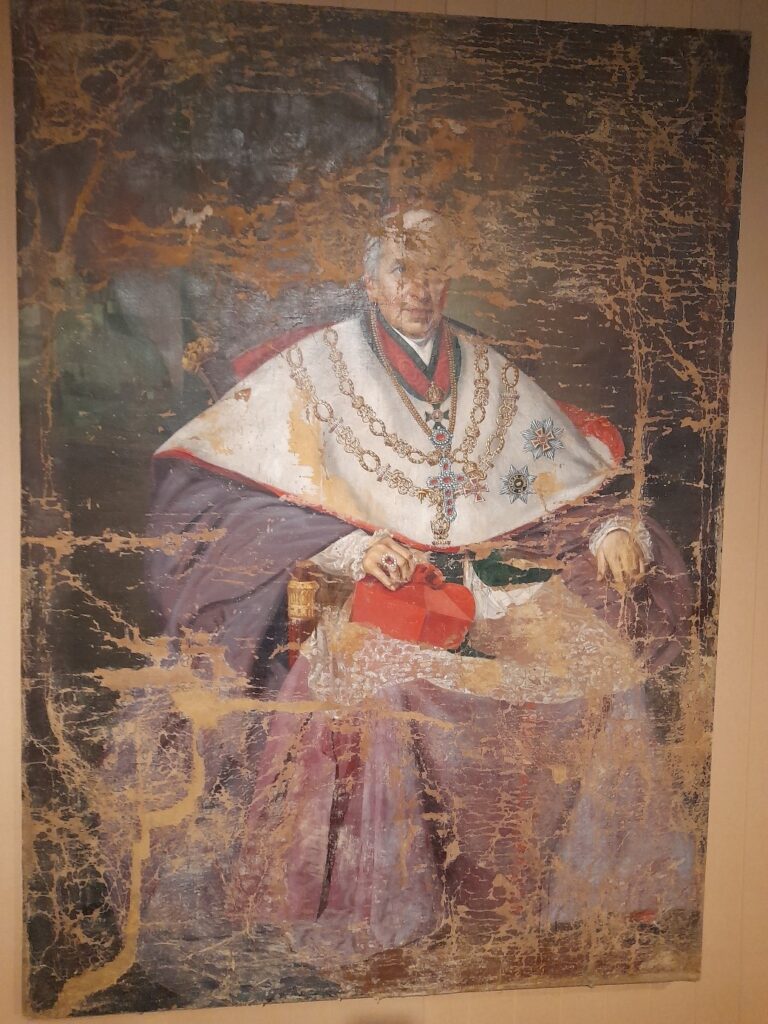Dnes tento obraz popis má. Takže je jasné, že na portréte je naozaj náš záhrebský arcibiskup a kardinál. Za to treba autorom výstavy dodatočne poďakovať. Pozornému divákovi však autori nastolili dilemu. Prečo vlastne je tu tento portrét vystavený? Vysvetliť by to mal kontext. Dva iné obrazy po ľavej a pravej strane kardinála. A popis pod jedným z nich, ktorý signalizuje, že by tu mal byť niekde vystavený „prestížny Kráľovský rád svätého Štefana...“. Kardinál má na sebe skutočne všelijaké vyznamenania. O ktorý rád tu vlastne ide, divák napokon pochopí až po pozornom prezretí si všetkých troch obrazov. Odvážim sa však povedať, že podstatu veci stačilo osvetliť nasledujúcim obrázkom.