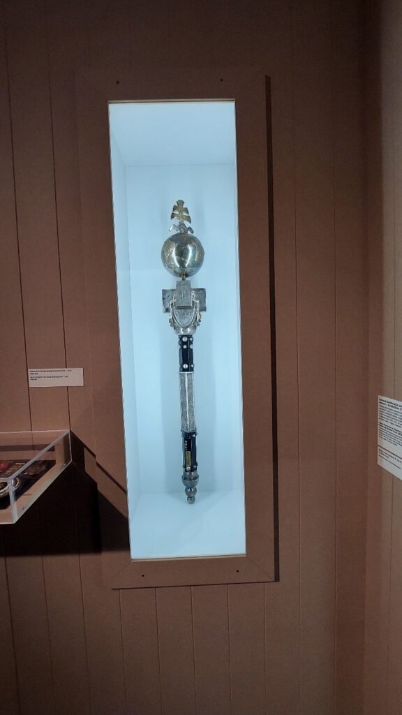 Iným výstavným kusom, ktorý si zaiste zaslúži pozornosť diváka, je podľa popisu „Rektorské žezlo Slovenskej univerzity, 1939 – 1945“. V skutočnosti však o žiadne rektorské žezlo nejde. Vystavené je tu žezlo prof. Ing. Dr. Františka Valentína, prvého dekana Prírodovedeckej fakulty Slovenskej univerzity, ktorého autorom je Ladislav Majerský († 1965). Používané bolo od roku 1942. Takýto omyl nie je smiešny. A vôbec smiešna nie je ani otázka, ktorá mi vŕtala v hlave, keď som ho tu uvidel. Prečo je to žezlo vlastne tu a nie je tam, kde by malo byť. Totiž medzi ostatnými žezlami dekanov prvej univerzity na Slovensku. V nejakej vitríne na prvom poschodí historickej budovy UK, kde bolo donedávna.