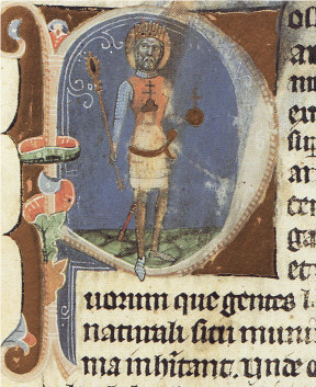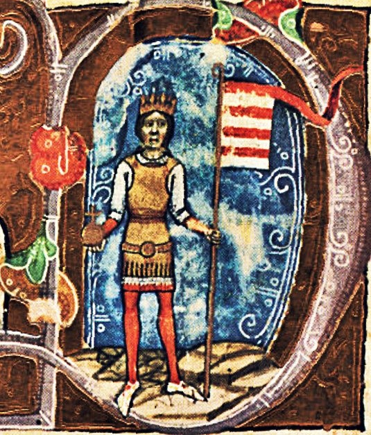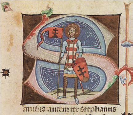 Svätý Štefan Kráľ. Vľavo s nitrianskou štandardou a štítom a tunikou s takzvanými Arpádovskými pruhmi. Vpravo v tunike so znakom Nitrianska. Zdroj: Obrázková kronika (druhá polovica 14. storočia).